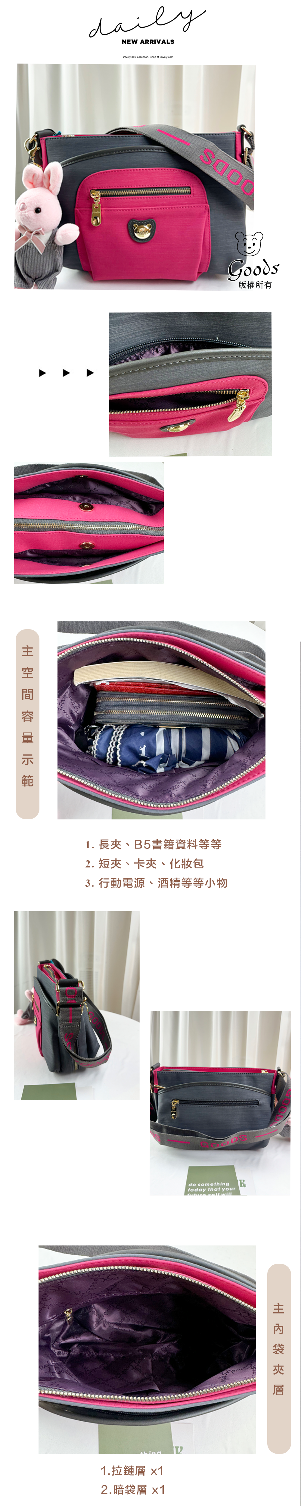 GOODS 灰桃拼色防潑水側背包 附兔兔吊飾 #2237