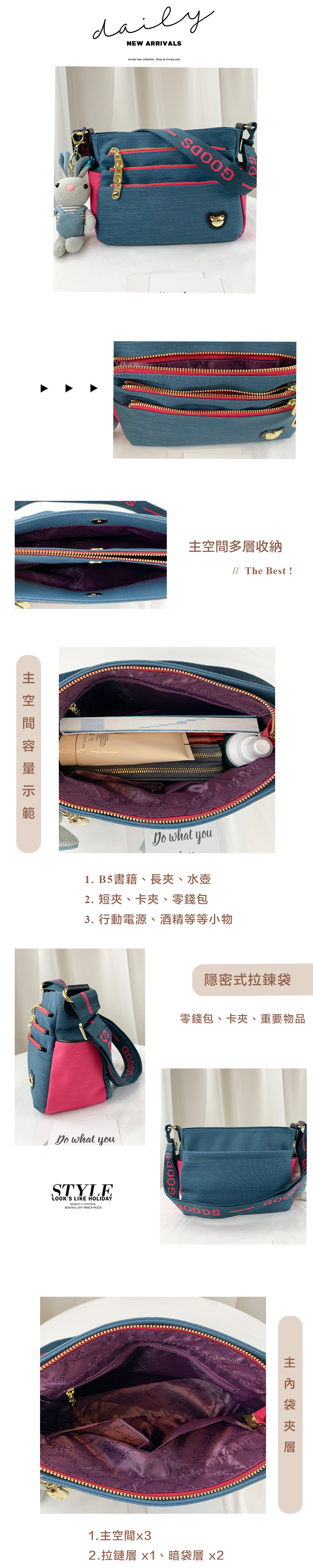 ●  規格:主空間x1  內拉鍊袋x1  暗格x2  前測拉鍊x3  後測拉鍊x1