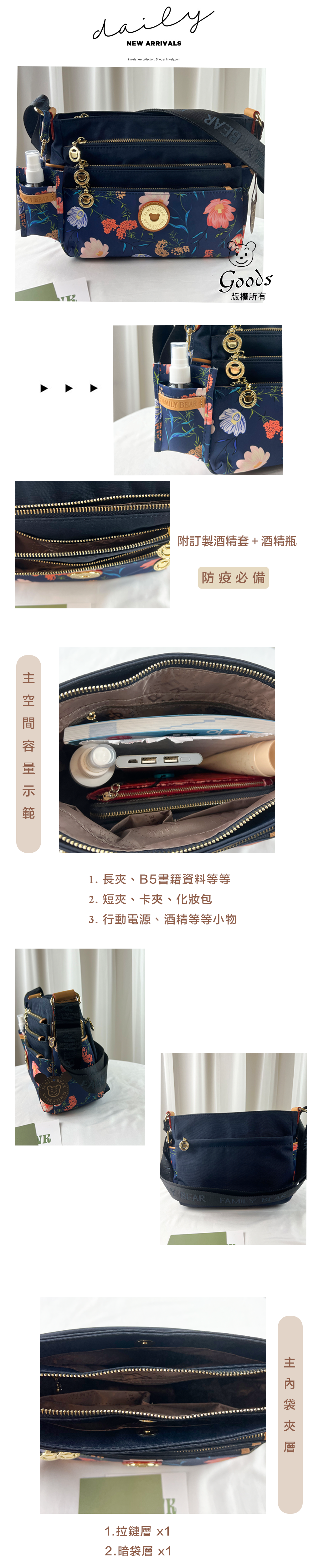 FamilyBear 藍橙花拼色防潑水側背包 附酒精保護套+酒精瓶 #2502