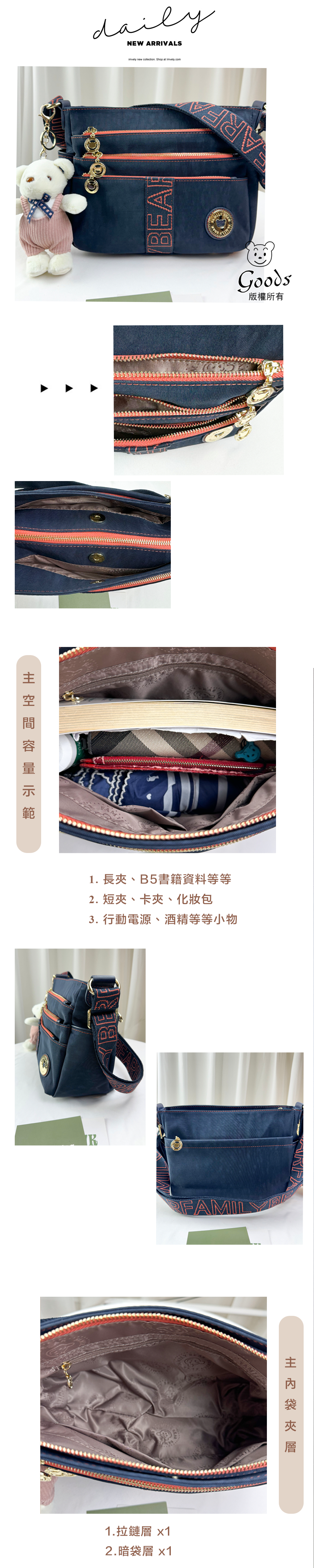 ●  規格:主空間x1  內拉鍊袋x1  暗格x2  前測拉鍊x3  後測拉鍊x1