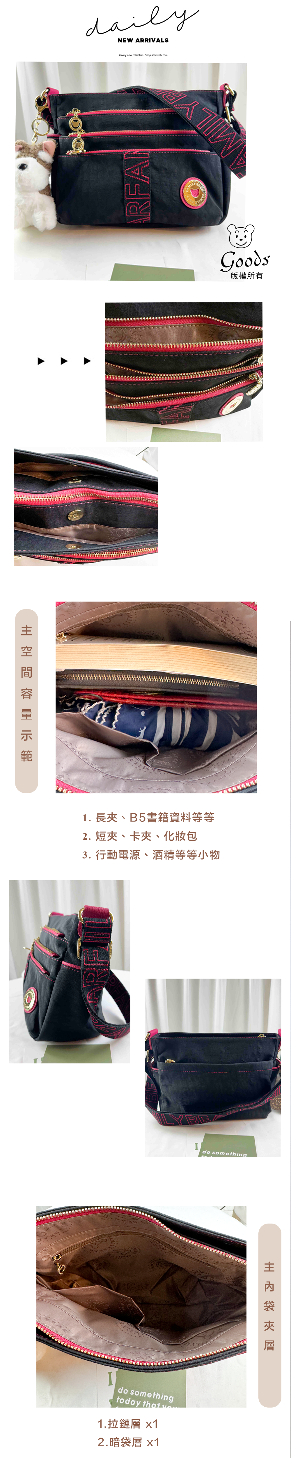 ●  規格:主空間x1  內拉鍊袋x1  暗格x2  前測拉鍊x3  後測拉鍊x1