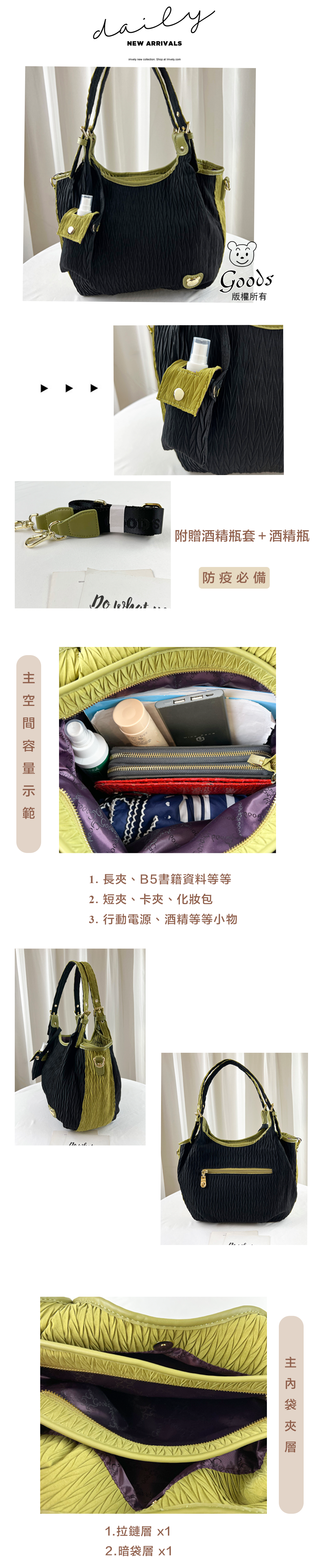 GOODS 綠配黑拼色皺皺防潑水手提包 / 側背包 附零錢包 #2520