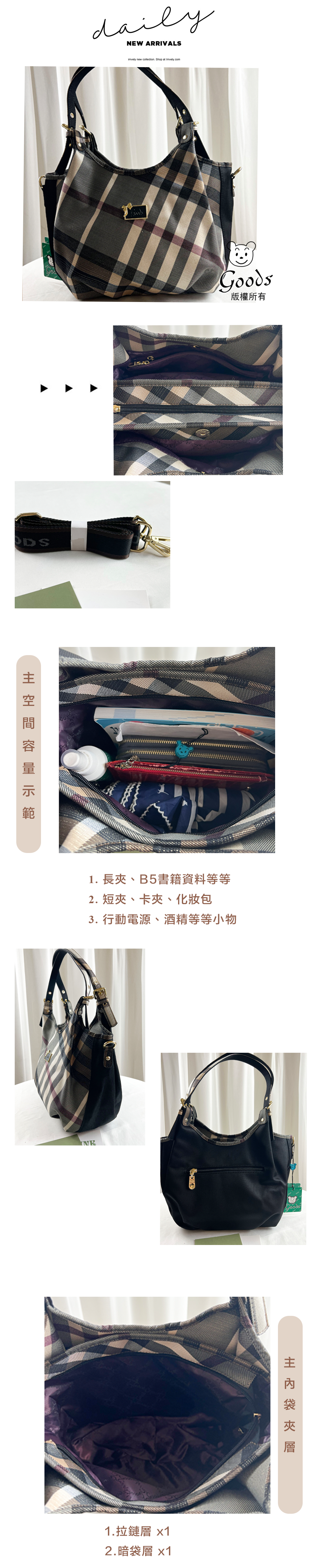 GOODS 金線大格黑拼色防潑水手提包 / 側背包 #2520