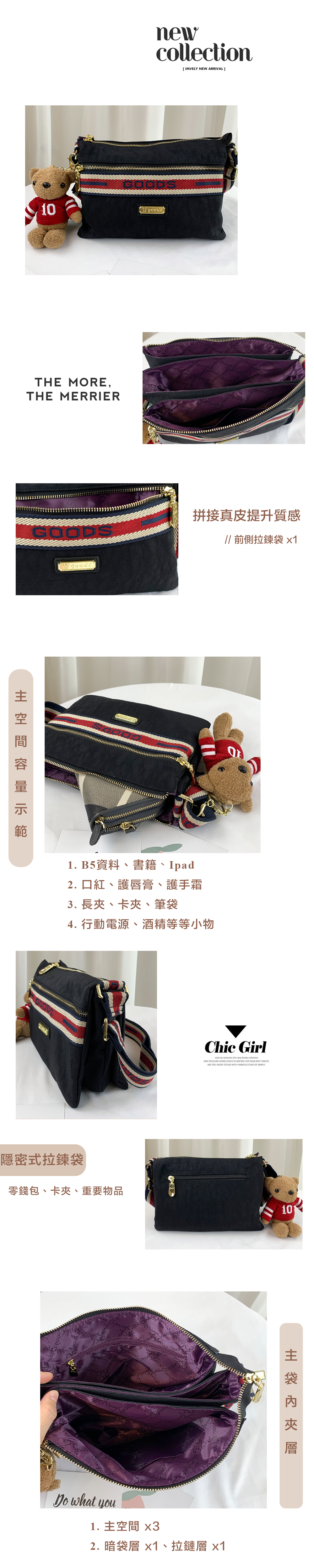 GOODS 織帶黑 水洗紋多層收納側背包 附小熊吊飾 #2522
