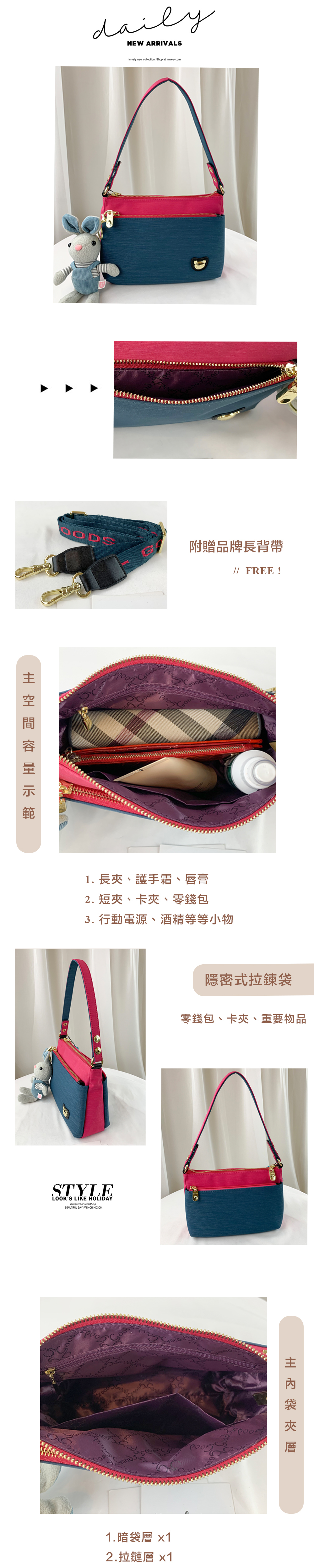 ●  規格:主空間x1  內拉鍊袋x1  暗格x1  前測拉鍊x1  後測拉鍊x1