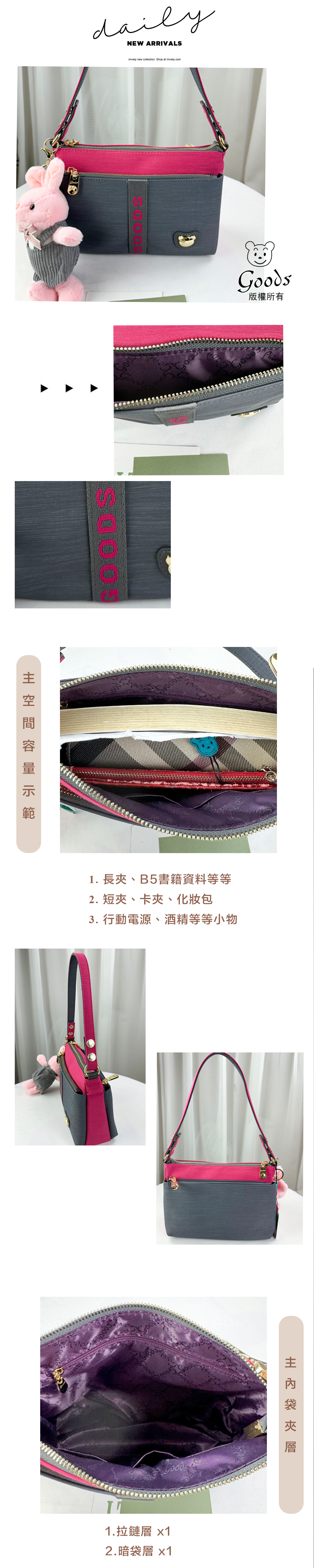 GOODS 灰桃拼色防潑水肩背包 / 側背包 附兔兔吊飾 #2563