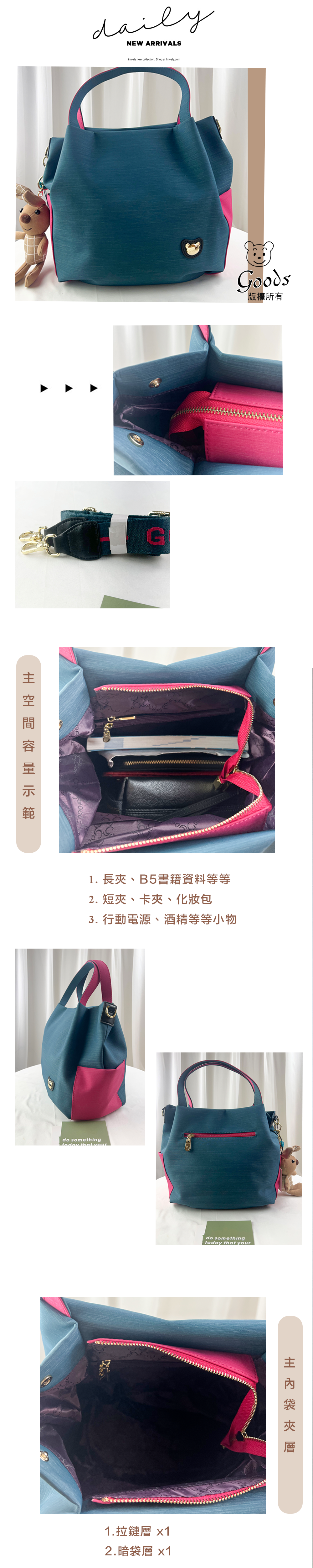 ●  規格:主空間x1  內拉鍊袋x2  暗格x1  後測拉鍊x1