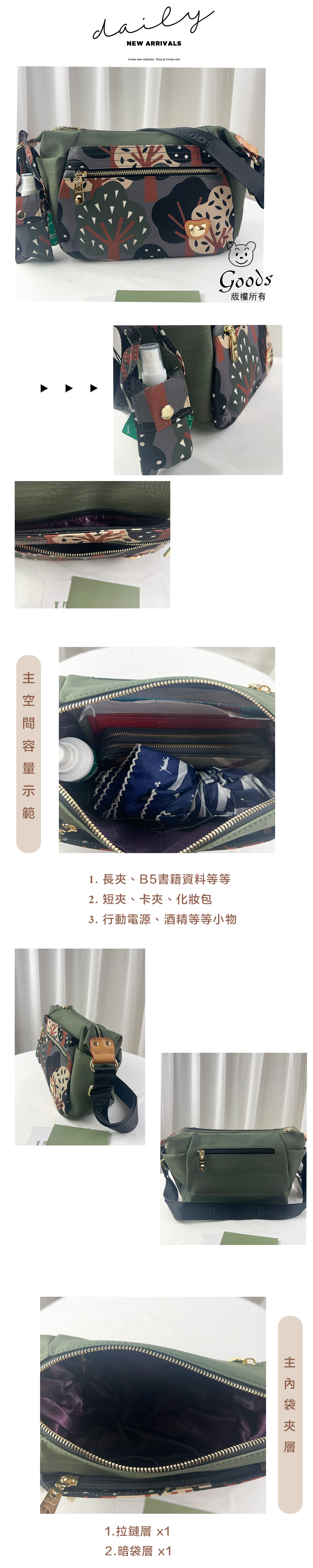 ●  規格:主空間x1  內拉鍊袋x1  暗格x2  前置拉鍊x2  後層拉鍊x1
