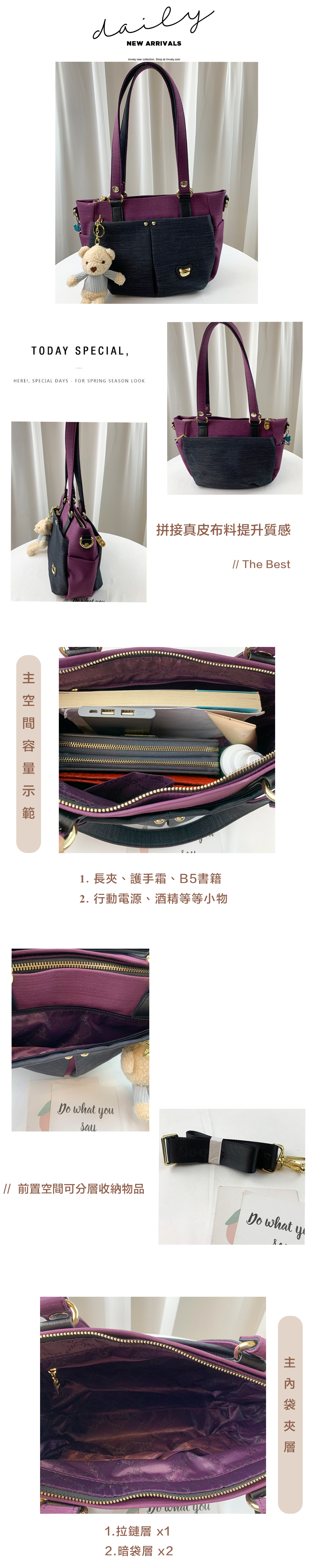 ●  規格:主空間x1  內拉鍊袋x2  暗格x2  前測拉鍊x1  後測拉鍊x1