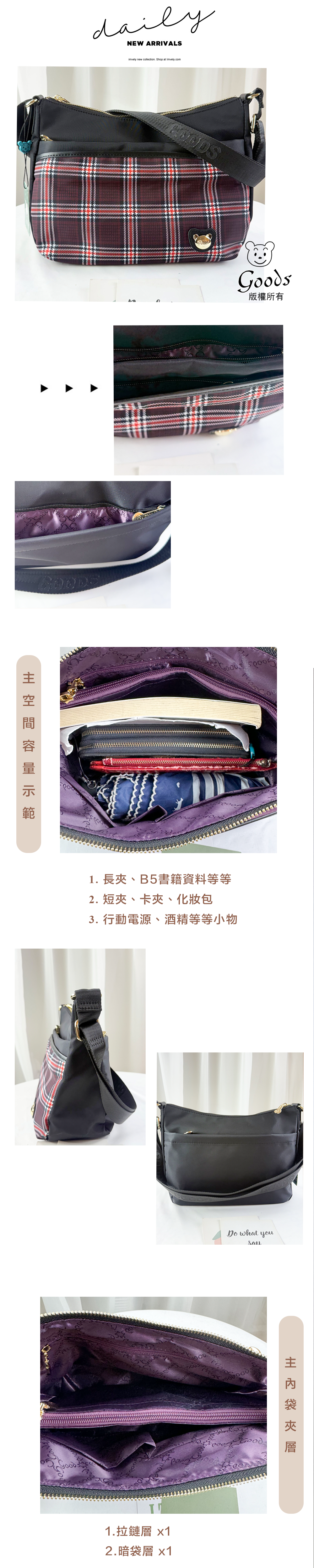 GOODS 英倫格紋紅拼色防潑水肩背包 / 側背包 #2638