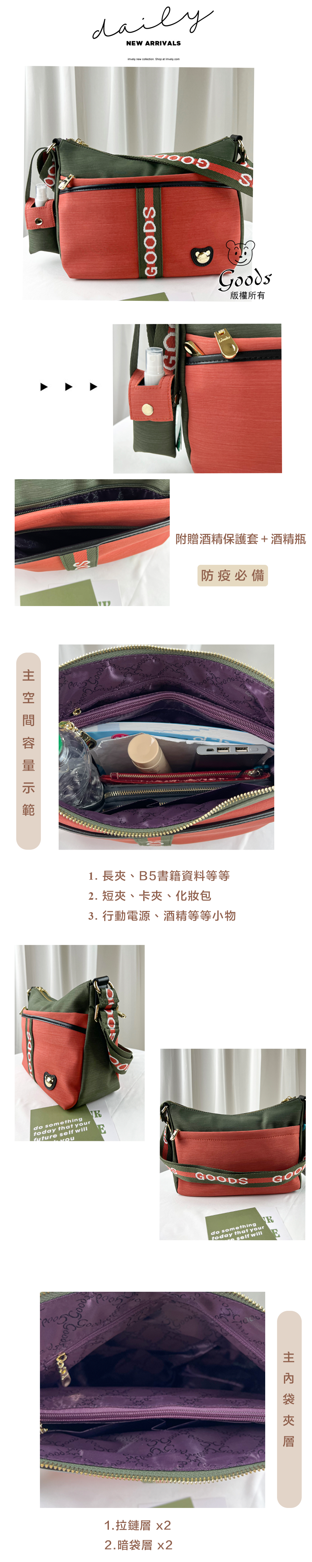 GOODS 橘綠拼色 防潑水側背包 附酒精保護套+酒精瓶 #2638