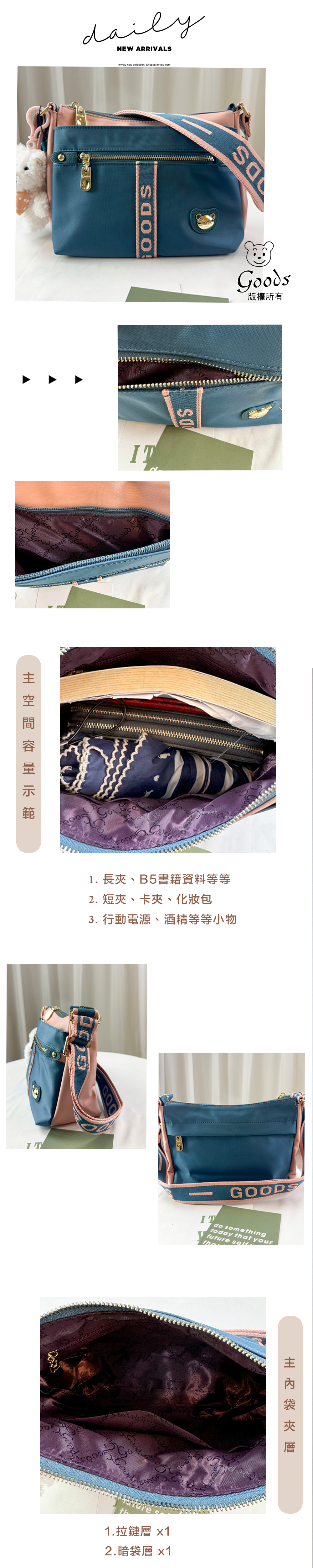 ●  規格:主空間x1  內拉鍊袋x1  暗格x1  前測拉鍊x2  後測拉鍊x1