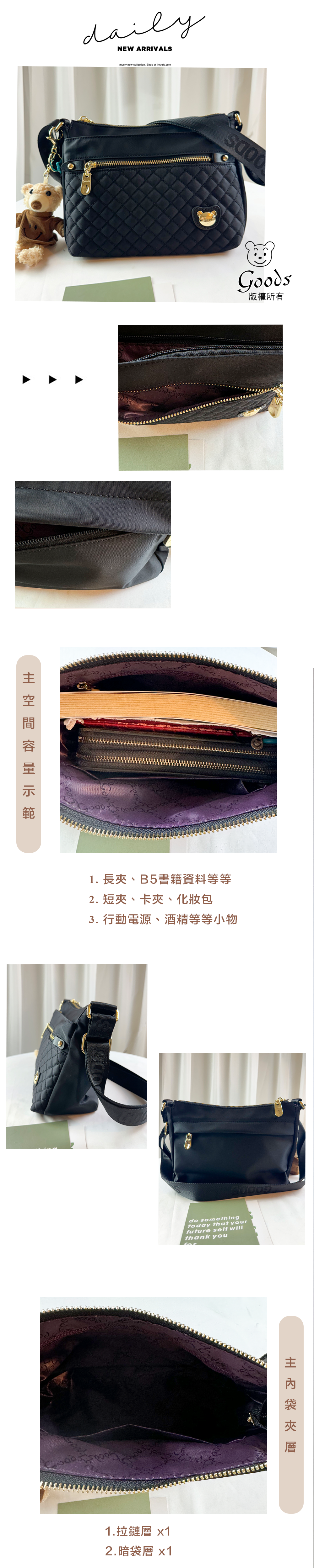 ●  規格:主空間x1  內拉鍊袋x1  暗格x1  前測拉鍊x2  後測拉鍊x1