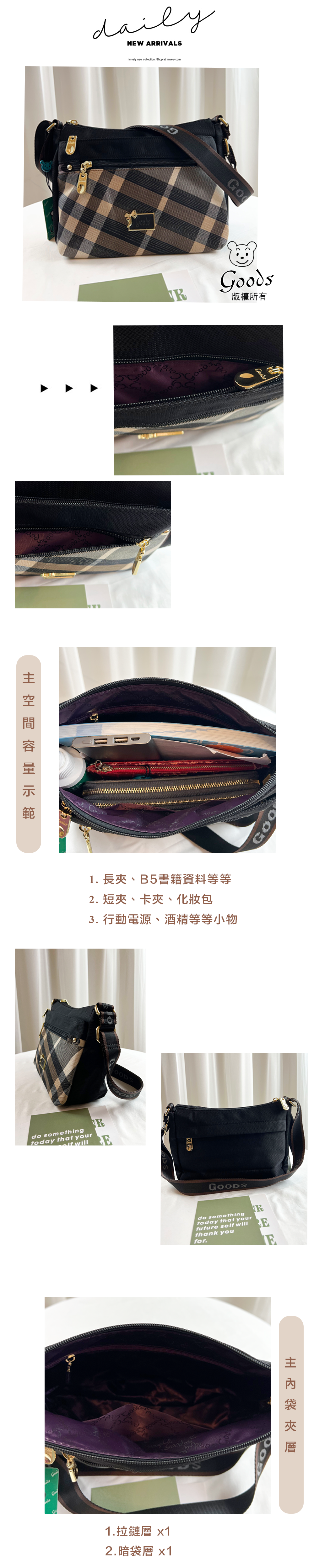 GOODS 金線大格黑拼色防潑水側背包 #2672