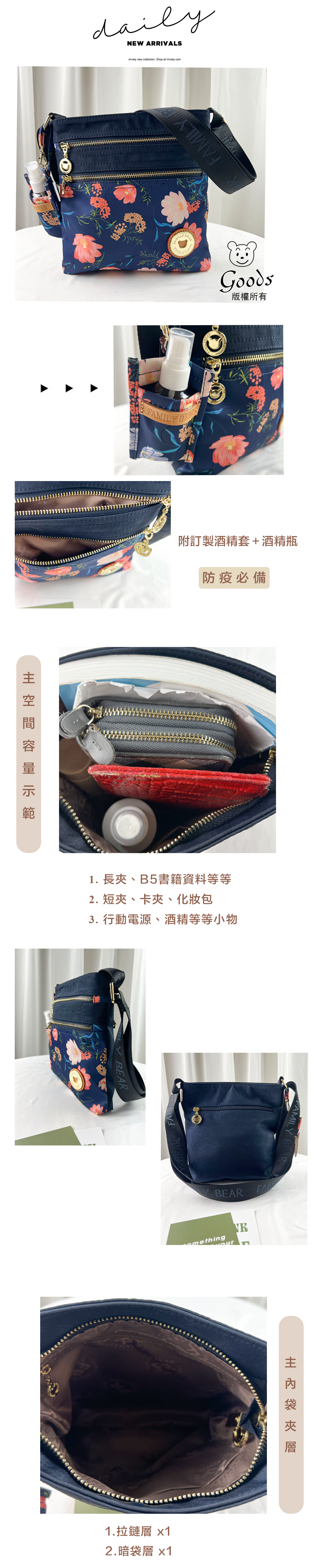 FamilyBear 藍橙花拼色防潑水側背包 附酒精保護套+酒精瓶 #2679