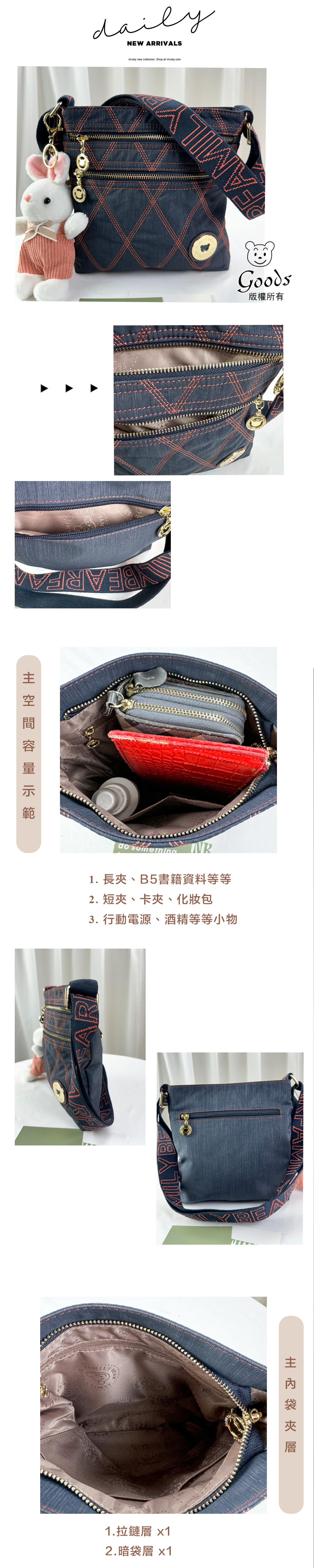 ●  規格:主空間x1  內拉鍊袋x1  暗格x1  前測拉鍊x2  後測拉鍊x1