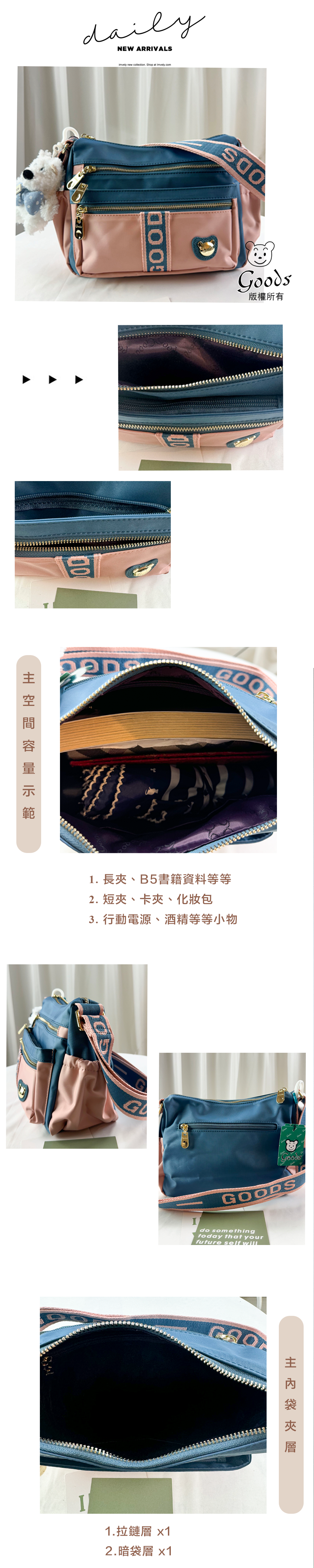 ●  規格:主空間x1  內拉鍊袋x2  暗格x1  前測拉鍊x3  後測拉鍊x1