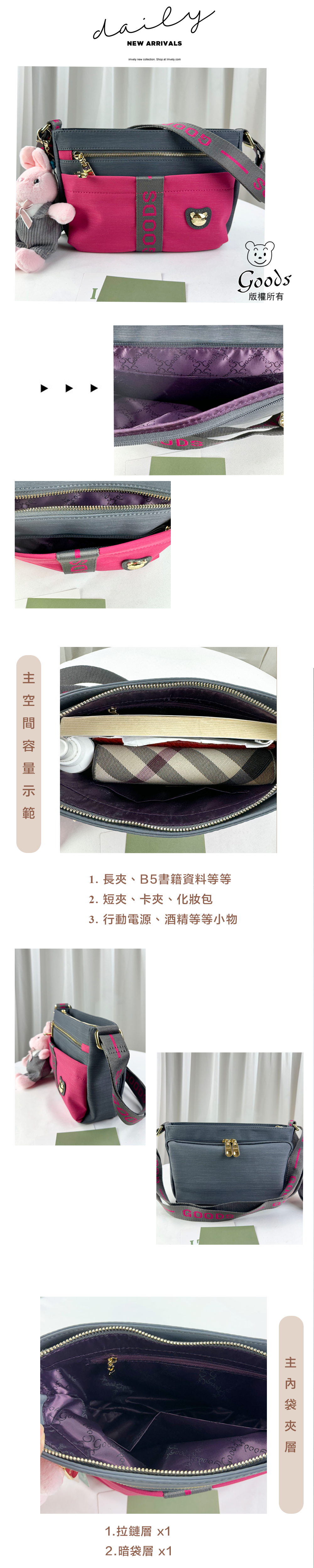 GOODS 灰桃拼色防潑水側背包 附兔兔吊飾 #2722