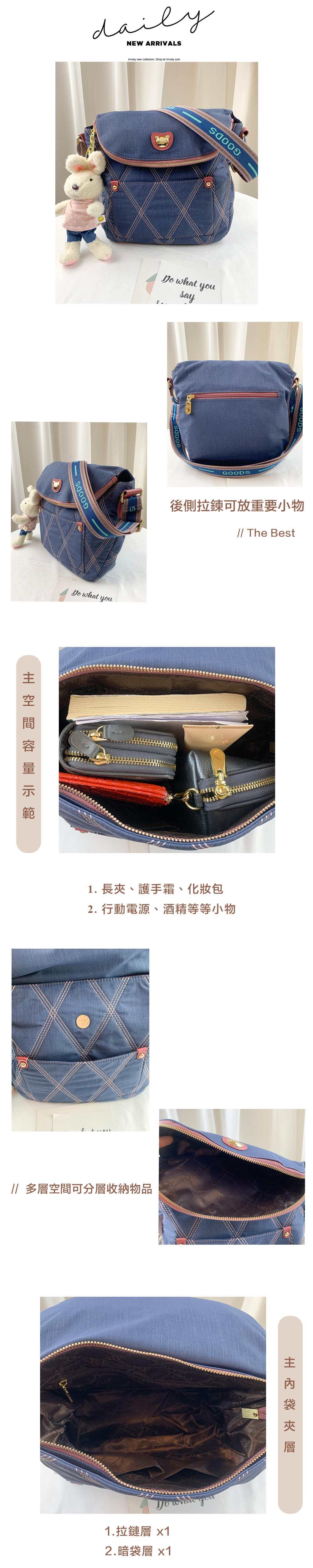 ●  規格:主空間x1  上方拉鍊袋x1  前置收納x1  後測拉鍊x1  內拉鍊袋x1  暗格x1