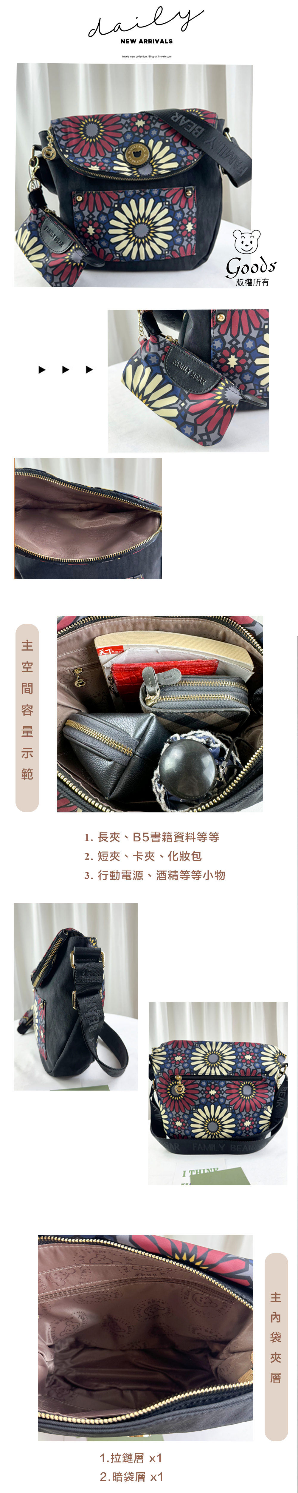 ●  規格:主空間x1  上方拉鍊袋x1  前置收納x1  後測拉鍊x1  內拉鍊袋x1  暗格x1