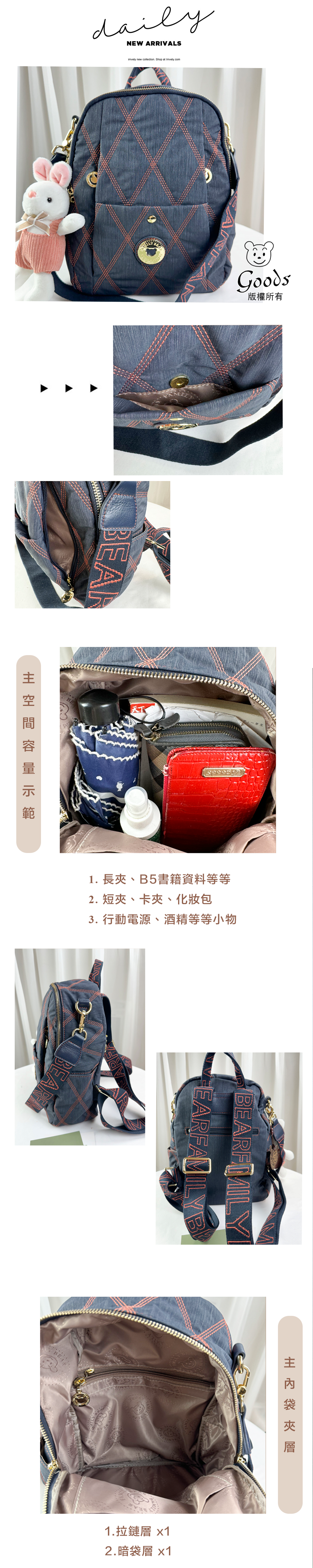 ●  規格:主空間x1  內拉鍊袋x2  暗格x1  前測拉鍊x2   前測磁扣x1  後測拉鍊x1