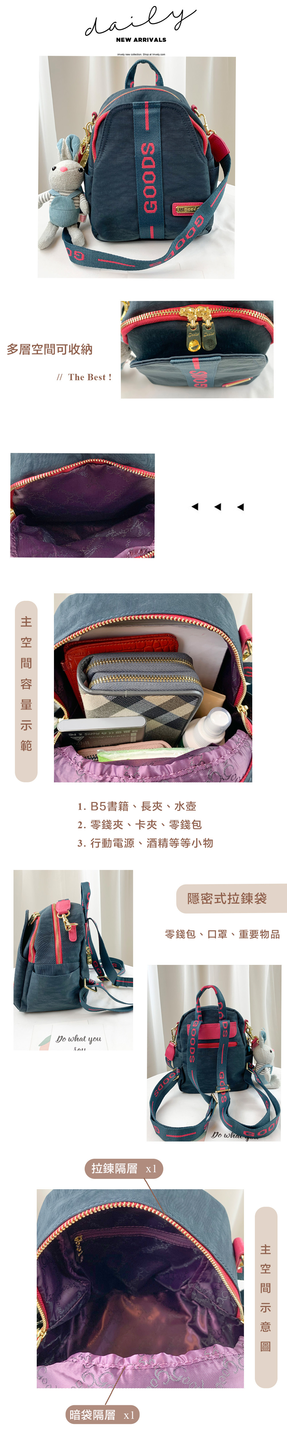●  規格:主空間x1  內拉鍊袋x1  暗格x1  前測拉鍊x1  前測磁扣x1  後測拉鍊x1  左右插袋各1