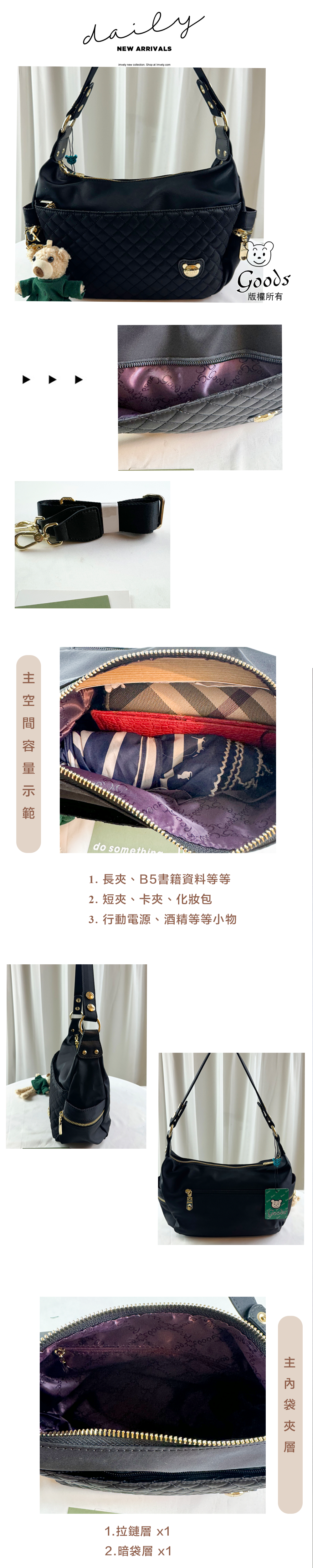 GOODS 黑色菱格紋防潑水肩背包 / 側背包 附小熊吊飾 #2754