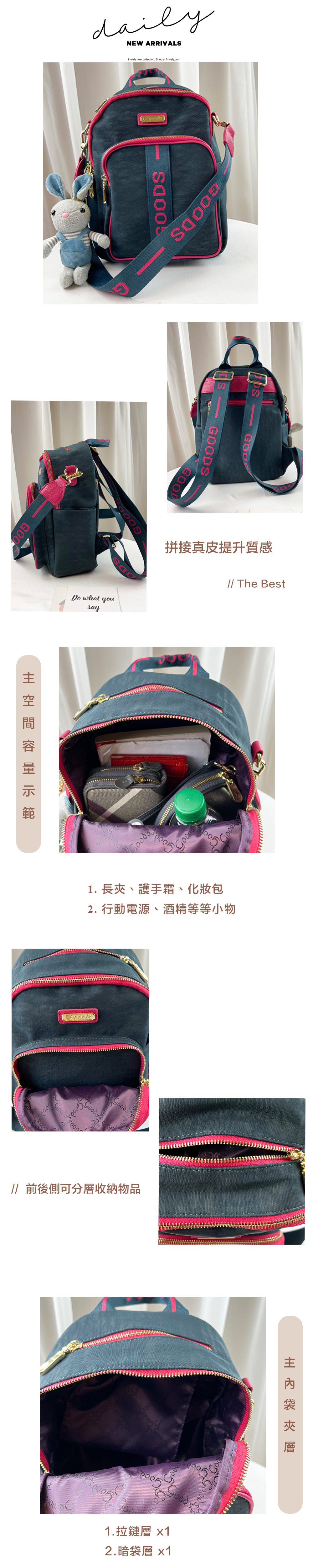 ●  規格:主空間x1  內拉鍊袋x1  暗格x1  前測拉鍊x1    後測拉鍊x1  上方拉鍊1