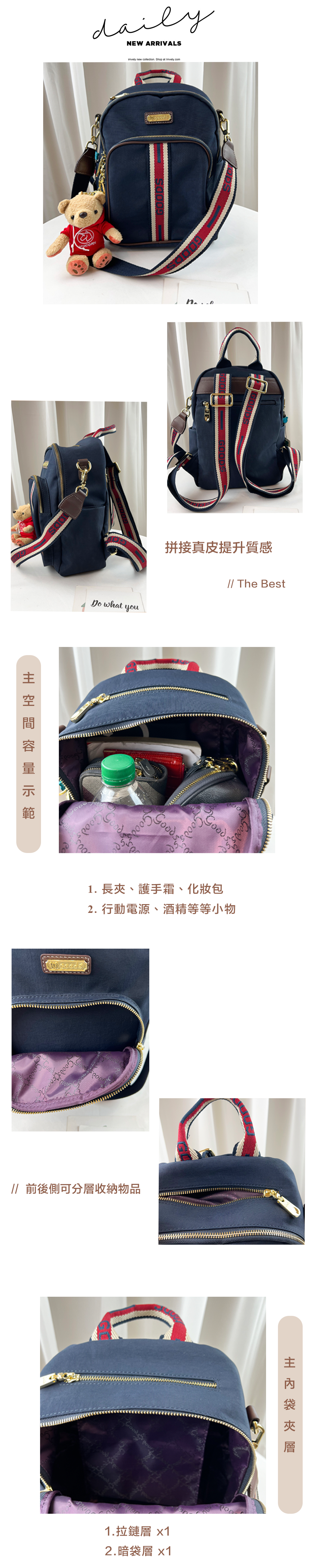 ●  規格:主空間x1  內拉鍊袋x1  暗格x1  前測拉鍊x1    後測拉鍊x1  上方拉鍊1
