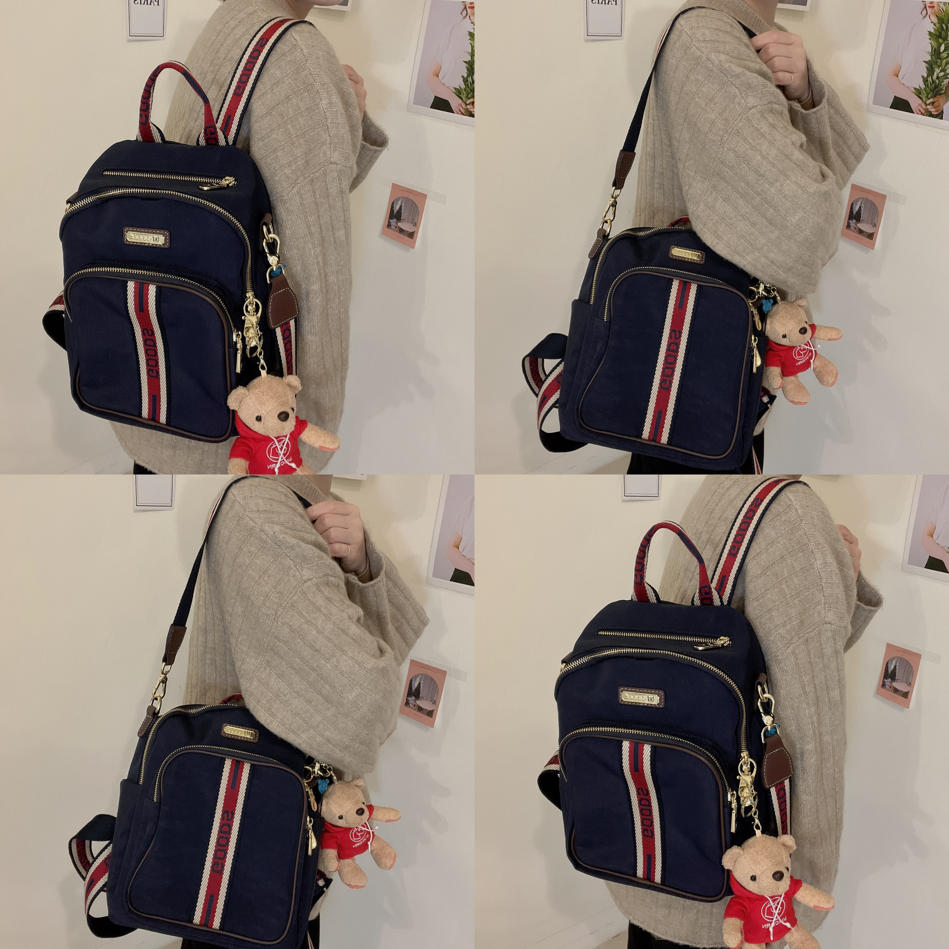 GOODS 織帶丹寧藍 運動風防潑水後背包 / 側背包 附小熊吊飾 #2795