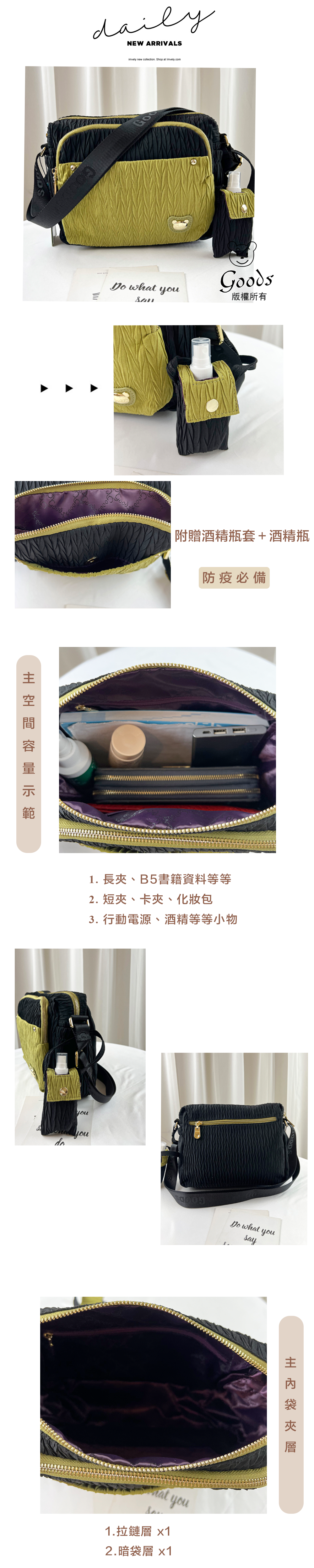 GOODS 綠配黑拼色皺皺防潑水側背包 附零錢包 #2804