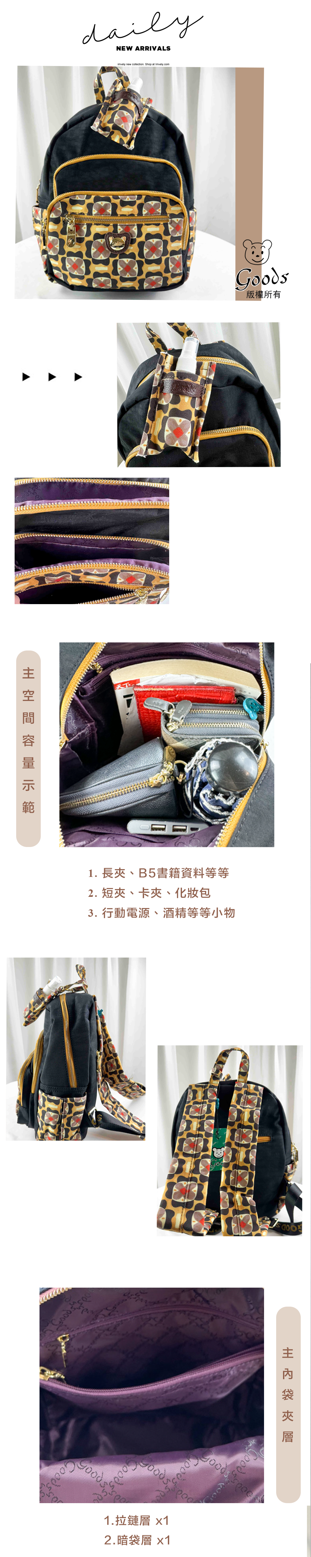 ●  規格:主空間x1  內拉鍊袋x2  暗格x1  前測拉鍊x3  後測拉鍊x1