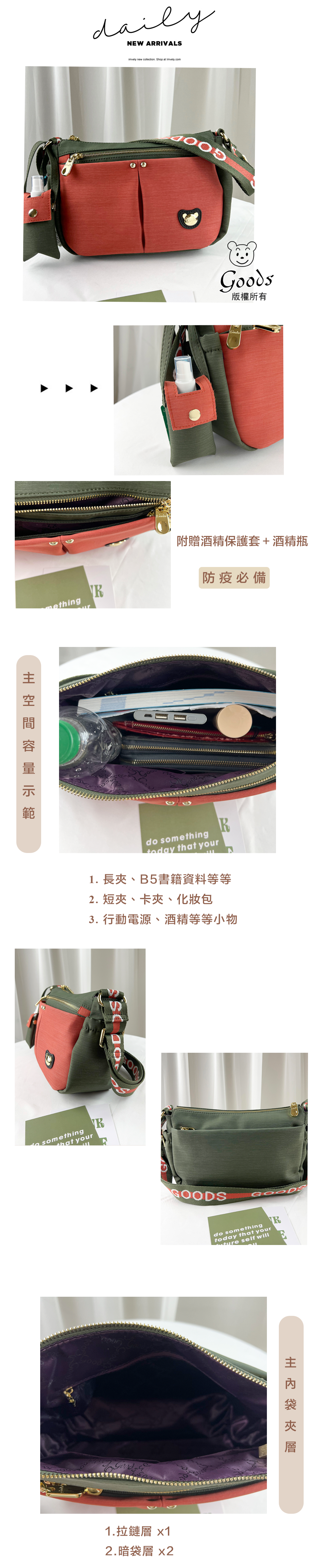 GOODS 橘綠拼色 防潑水側背包 附酒精保護套+酒精瓶 #2806