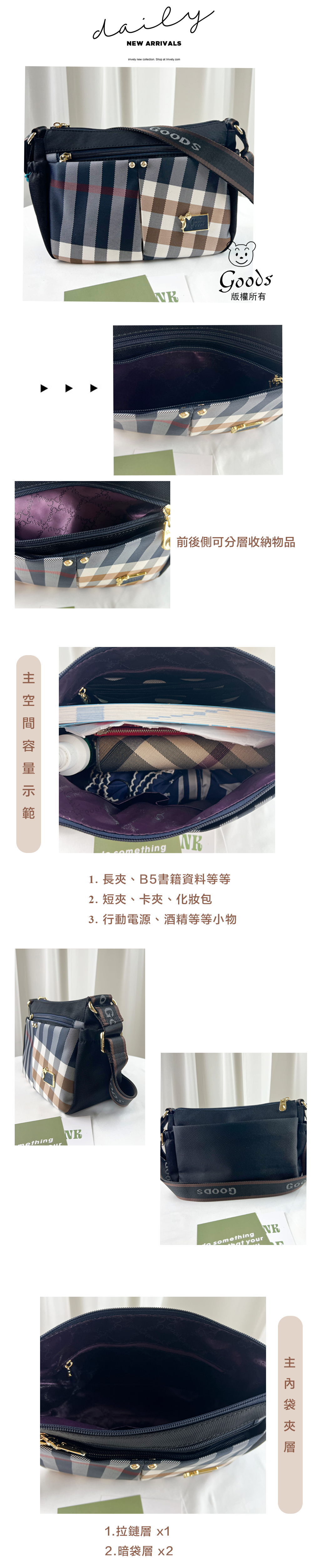 GOODS 英倫格紋藍拼色防潑水側背包 #2806