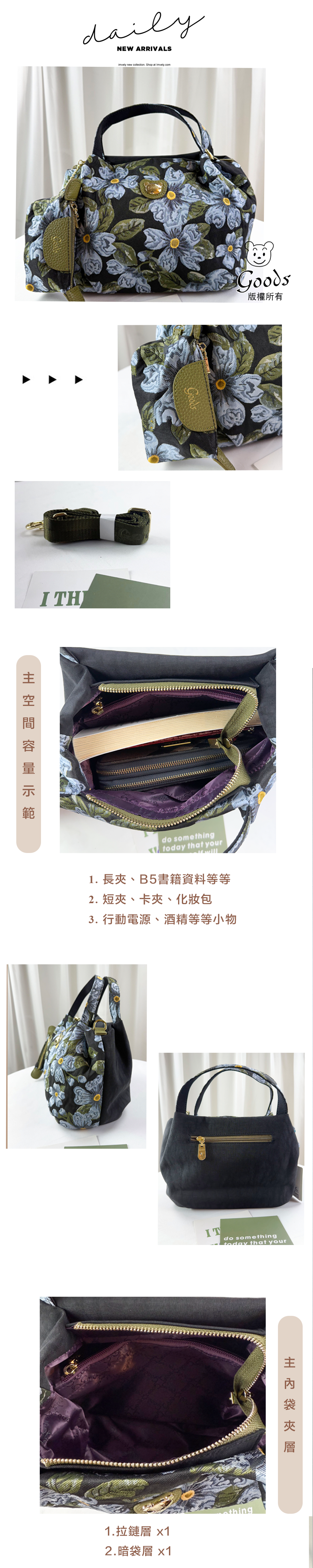 ●  規格:主空間x1  內拉鍊袋x1  暗格x1  後置拉鍊x1