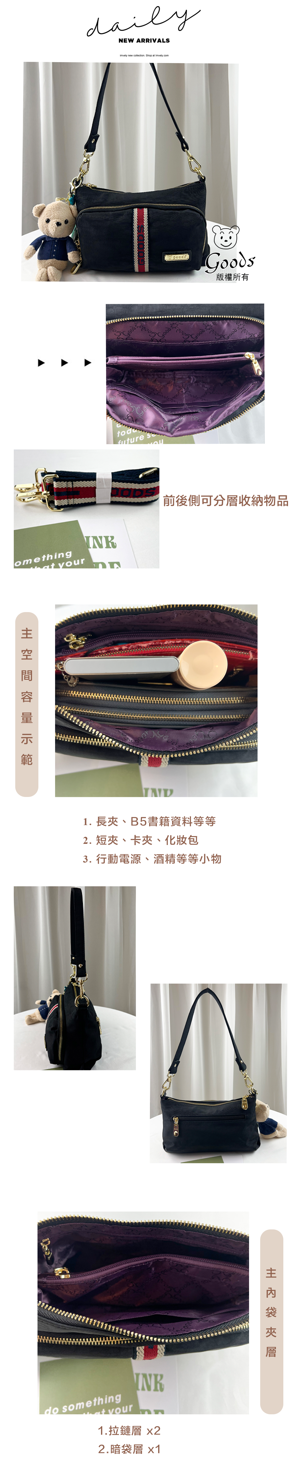 ●  規格:主空間x1  內拉鍊袋x2  暗格x1  前測拉鍊x1  後測拉鍊x1