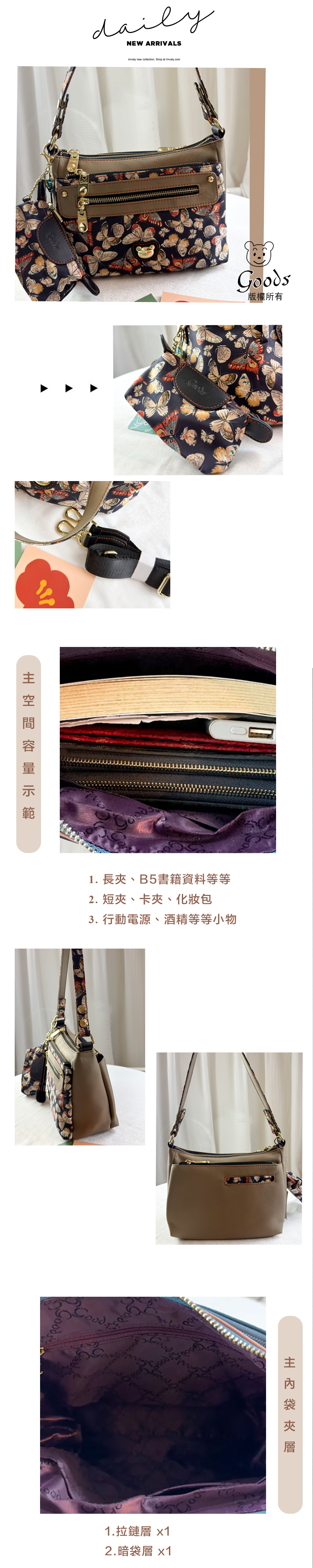 ●  規格:主空間x1  內拉鍊袋x1  暗格x1  前測拉鍊x2  後測拉鍊x1