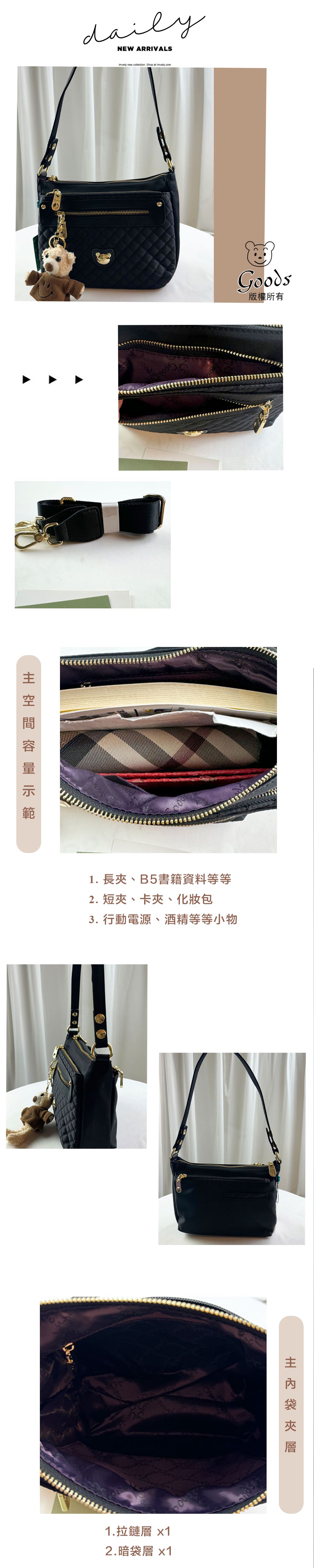 GOODS 黑色菱格紋防潑水肩背包 / 側背包 附小熊吊飾 #2820
