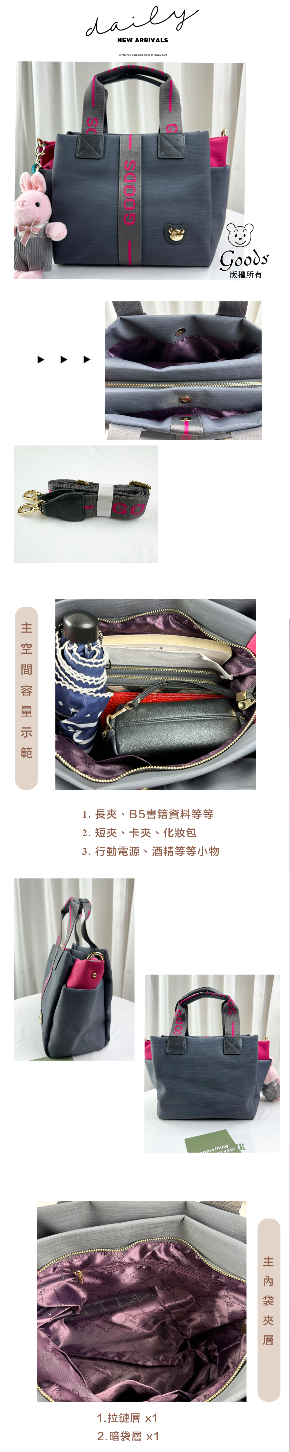 ●  規格:主空間x1  內拉鍊袋x1  暗格x1  後置拉鍊x1