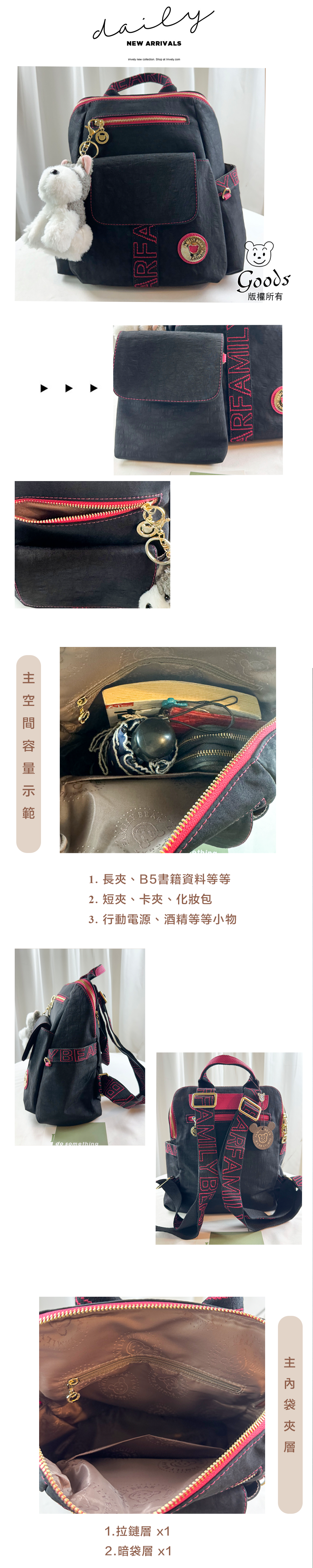 ●  規格:主空間x1  內拉鍊袋x1  暗格x1  前測拉鍊x1  前測磁扣x1  後測拉鍊x1  左右插袋各1