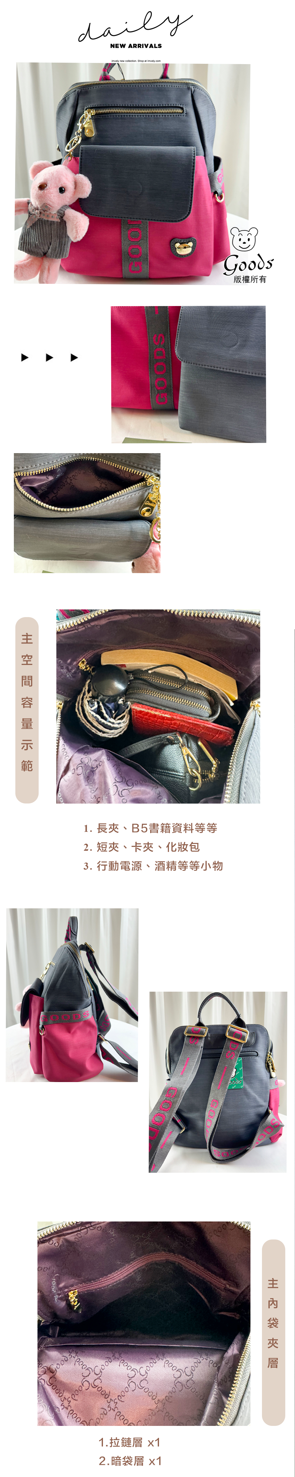 ●  規格:主空間x1  內拉鍊袋x1  暗格x1  前測拉鍊x1  前測磁扣x1  後測拉鍊x1  左右插袋各1
