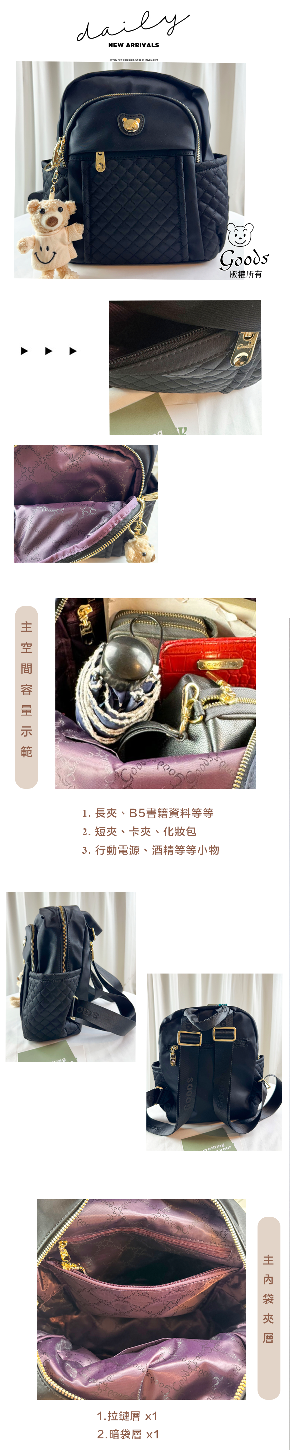 GOODS 黑色菱格紋防潑水後背包 附小熊吊飾 #2857