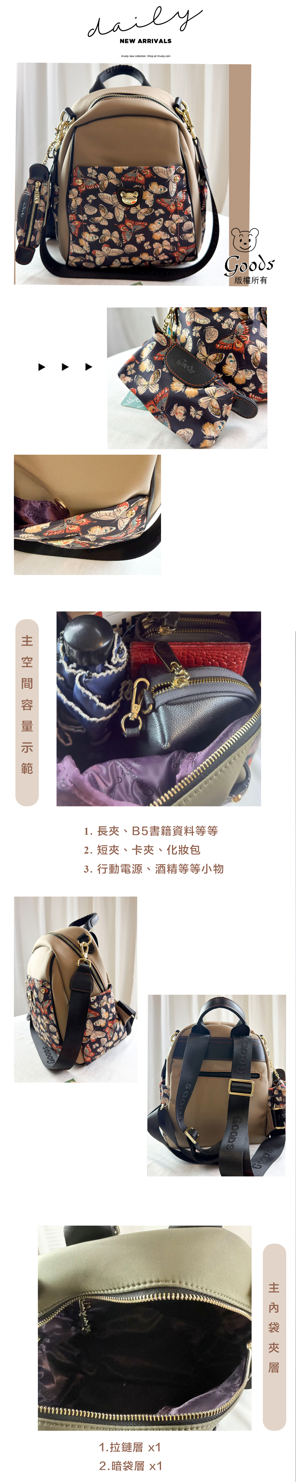 ●  規格:主空間x1  內拉鍊袋x1  暗格x1  前測拉鍊x2  後測拉鍊x1