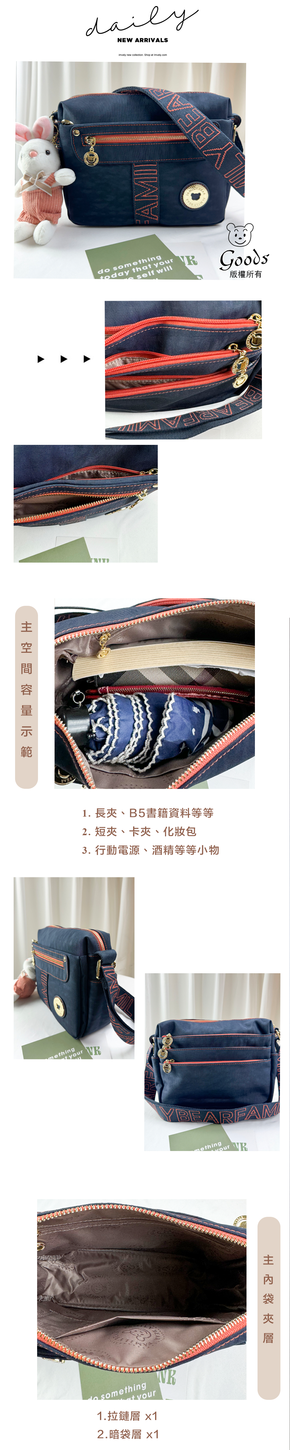 ●  規格:主空間x1  內拉鍊袋x1  暗格x1  前測拉鍊x2  後測拉鍊x3