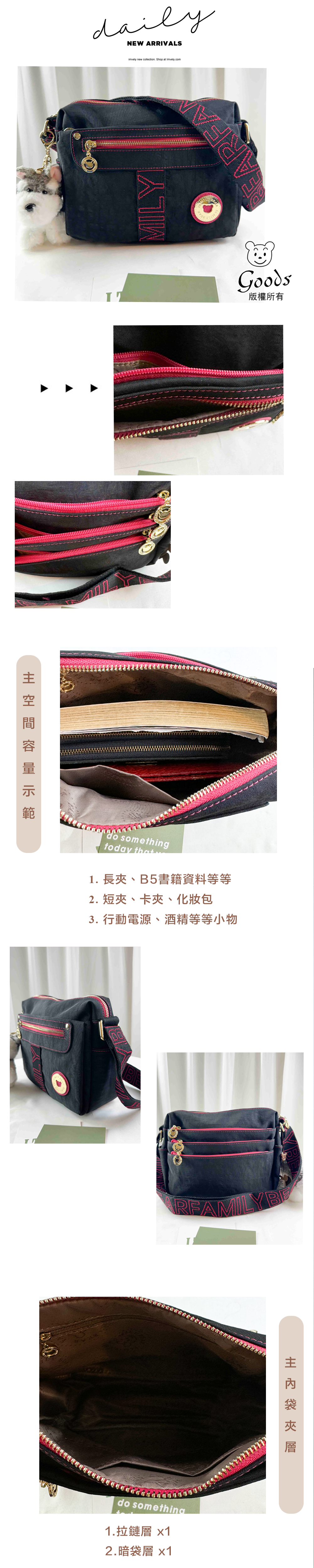 ●  規格:主空間x1  內拉鍊袋x1  暗格x1  前測拉鍊x2  後測拉鍊x3