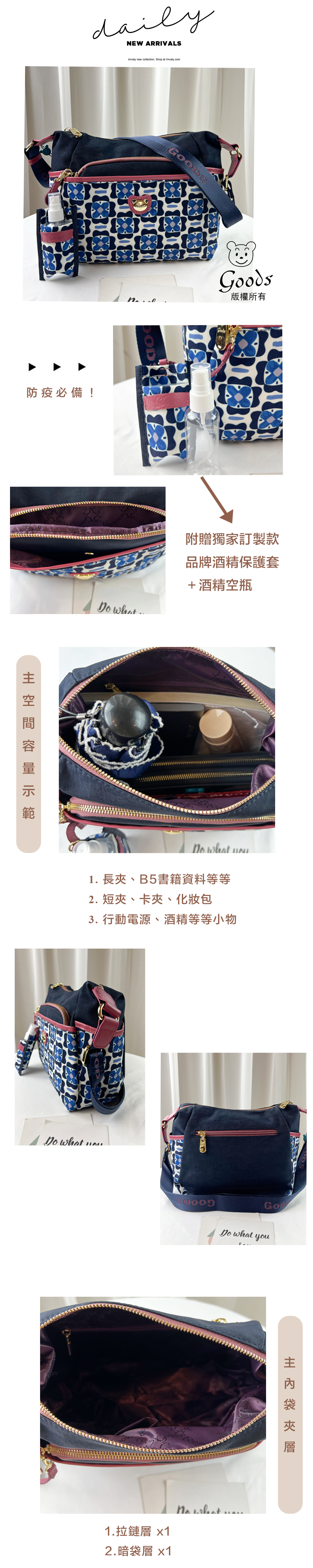 ●  規格:主空間x1  內拉鍊袋x1  暗格x2  前測拉鍊x1  前測磁扣x1  後測拉鍊x1
