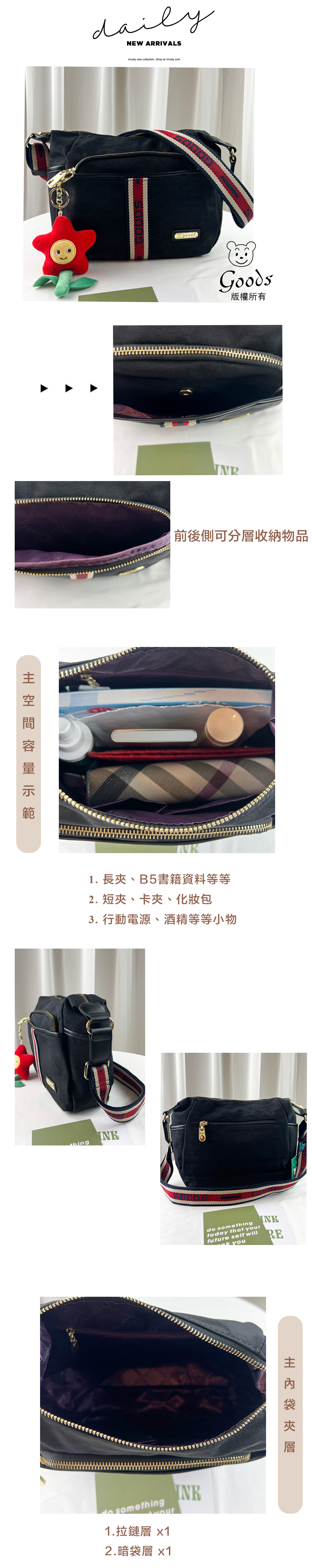 GOODS 織帶黑 防潑水側背包 附吊飾 #6153
