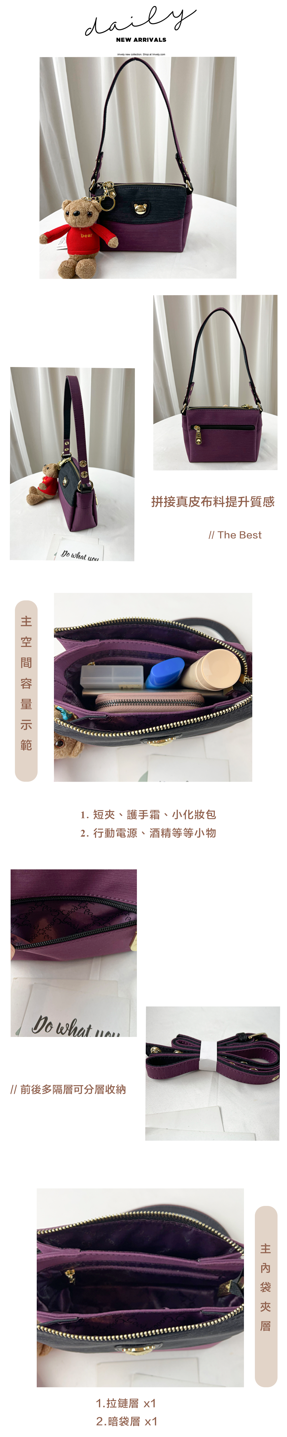●  規格:主空間x3  內拉鍊袋x1  暗格x1  後測拉鍊x1