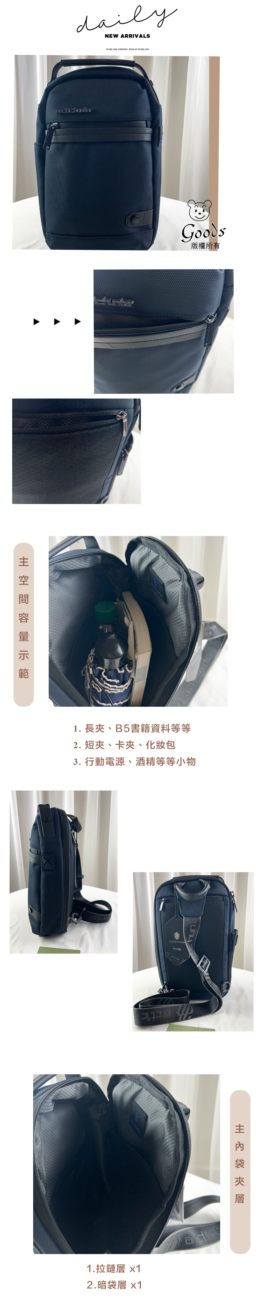 ●  規格:主空間x1  內拉鍊袋x1  暗格x1  前測收納x1  後測收納x1