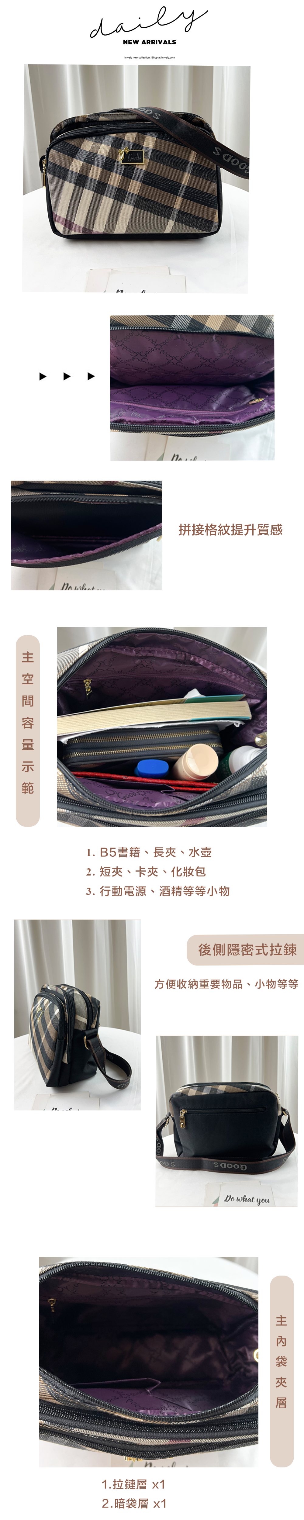 ●  規格:主空間x1  內拉鍊袋x1  暗格x2  前置拉鍊x2  後側拉鍊x1